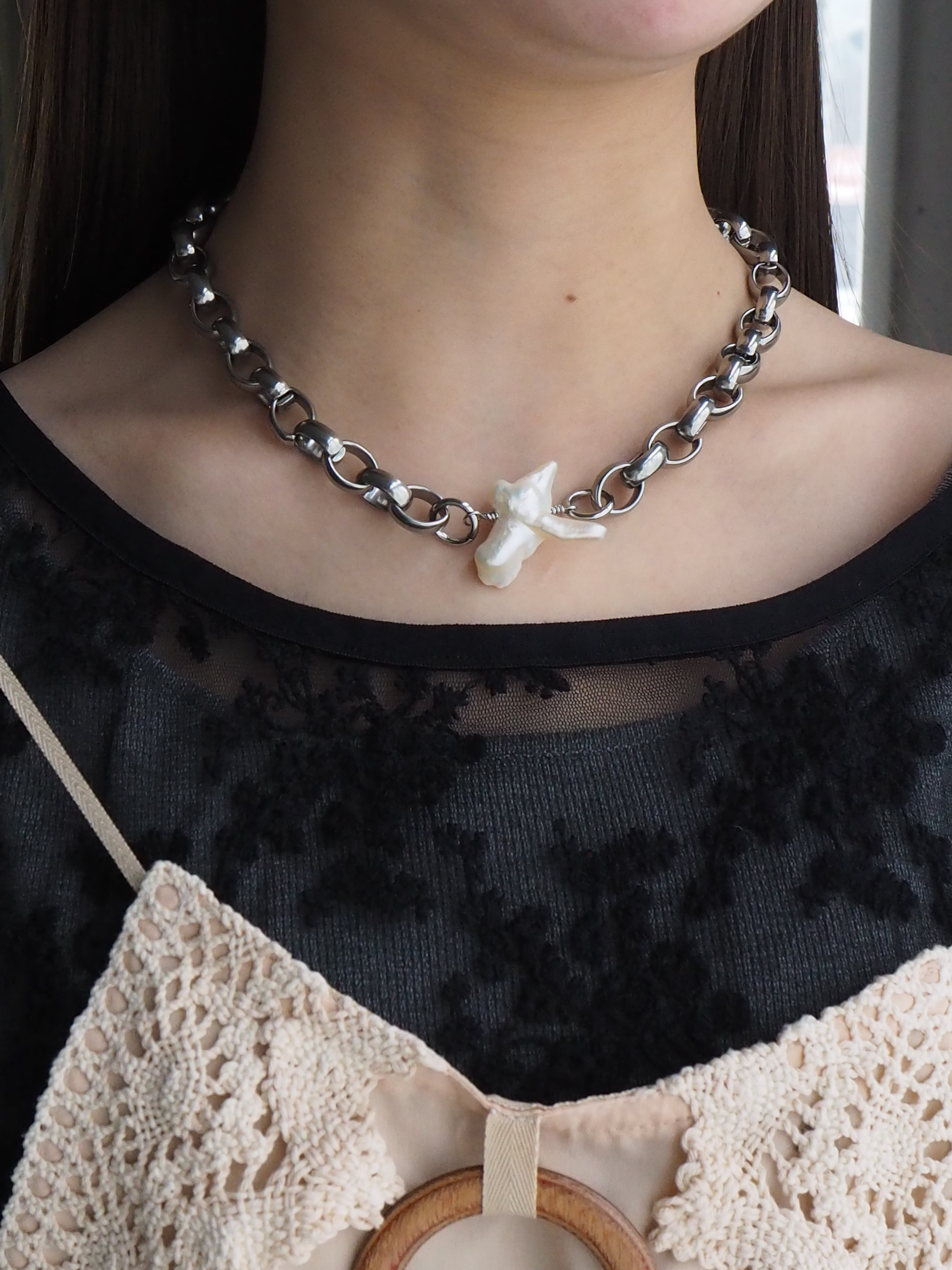 幸運を祈る仕草のようにも見えるユニークな形の淡水パールを、重量感のあるチェーンと。