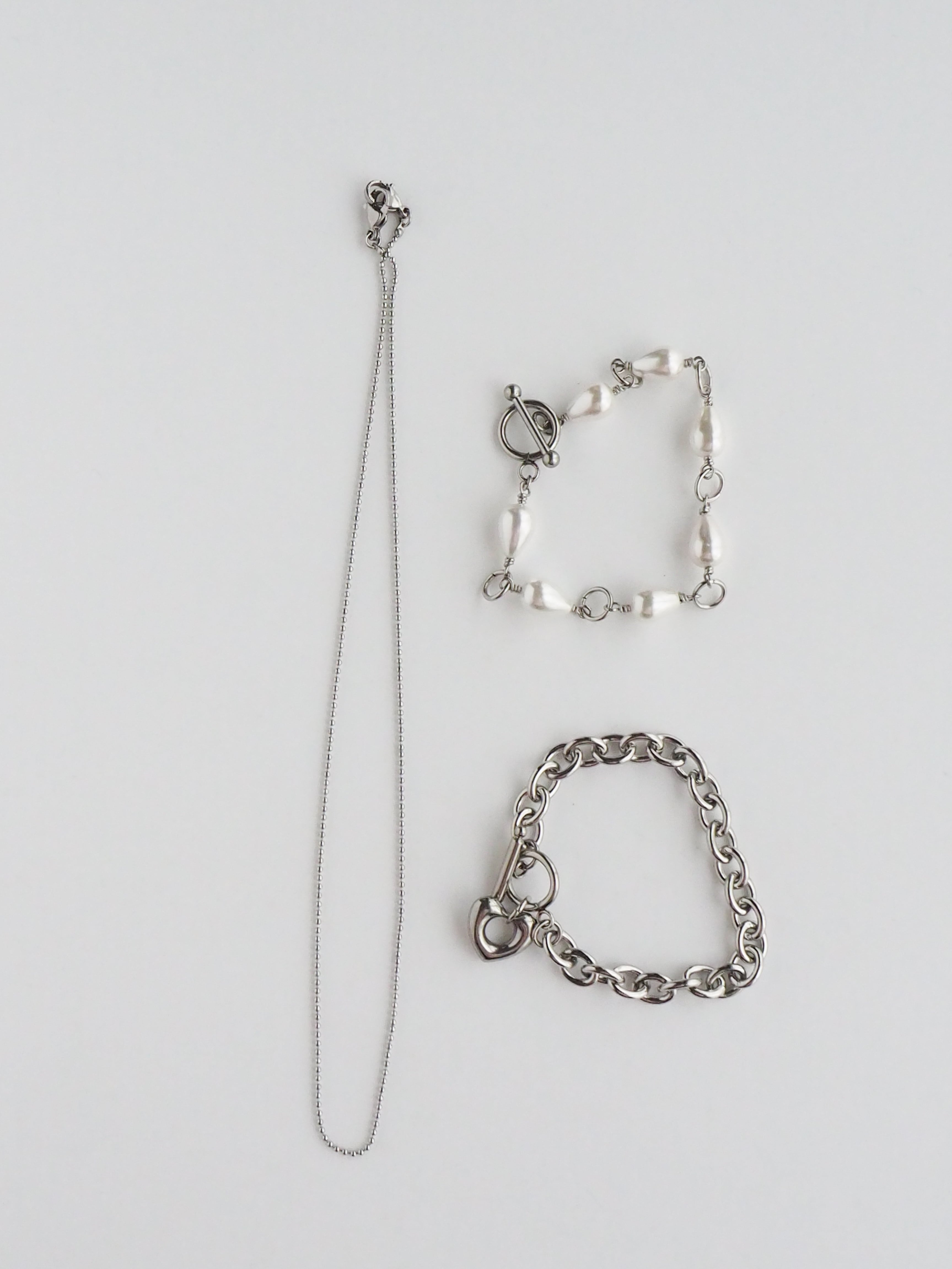 細いチェーンネックレスをアシンメトリーに組み合わせたり、ばらばらにしてブレスレットとネックレスで楽しんだり。
