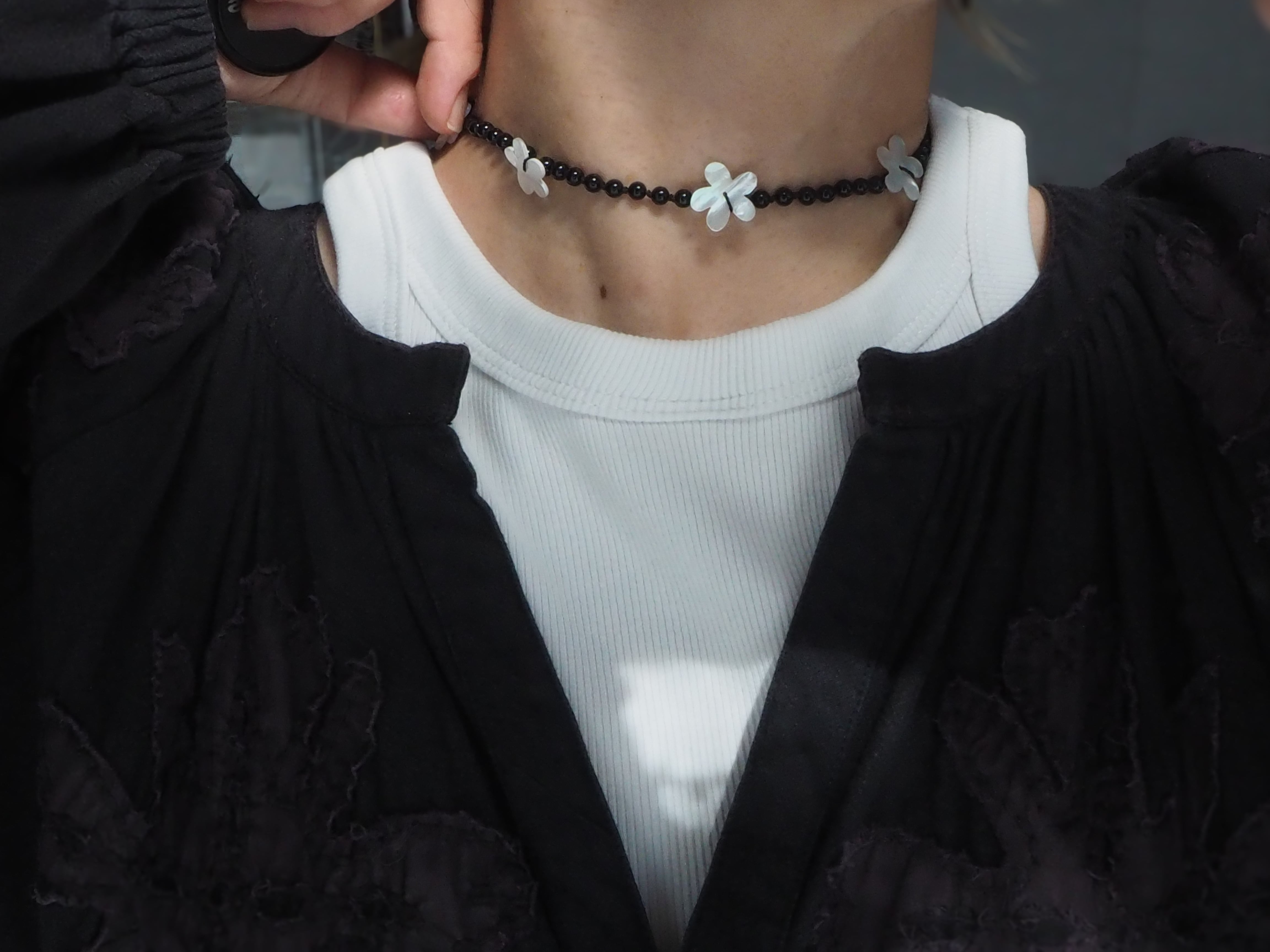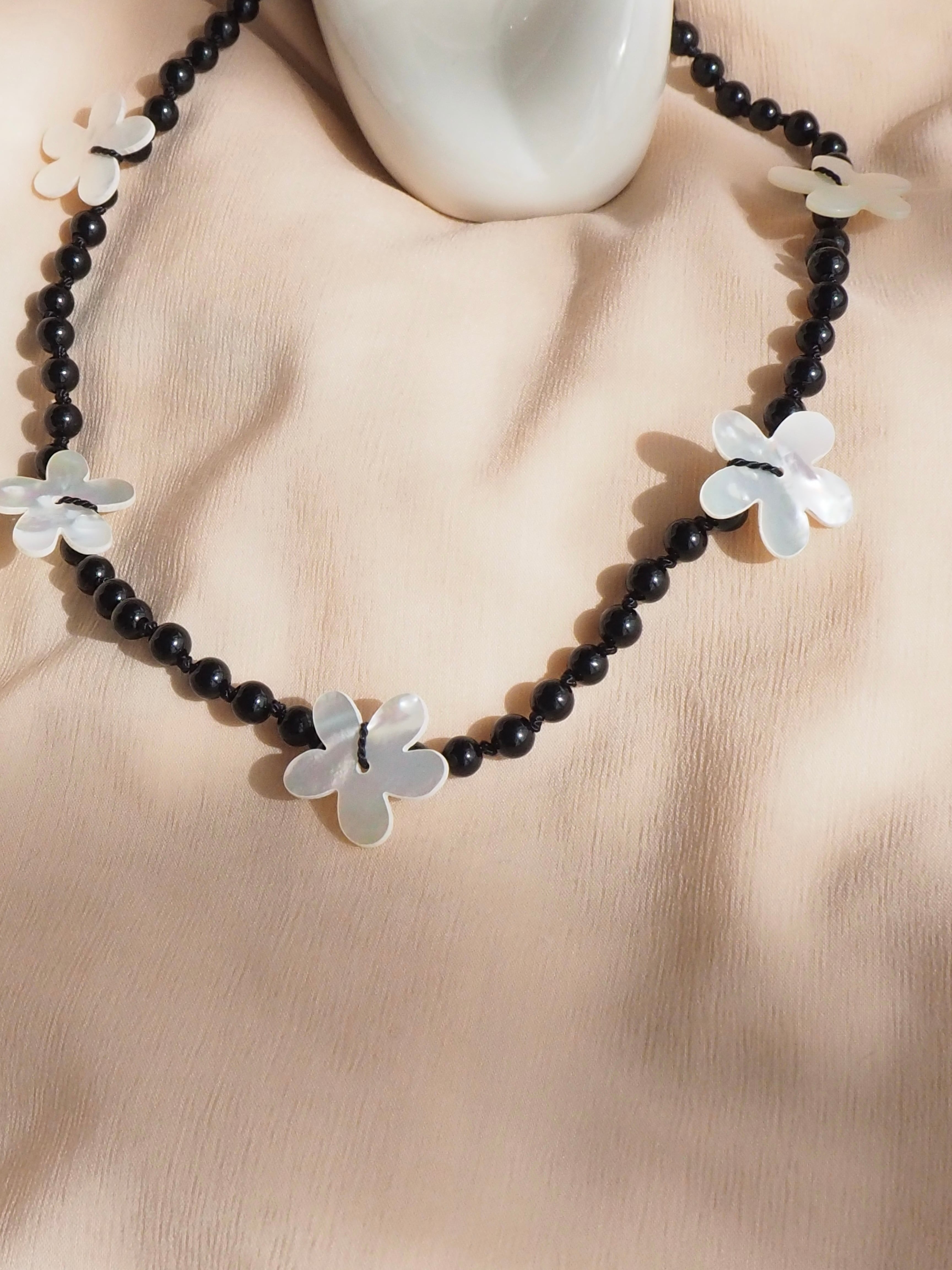 ブラックオニキスとシェルのお花で首元にふわふわとお花が咲くようなデザイン